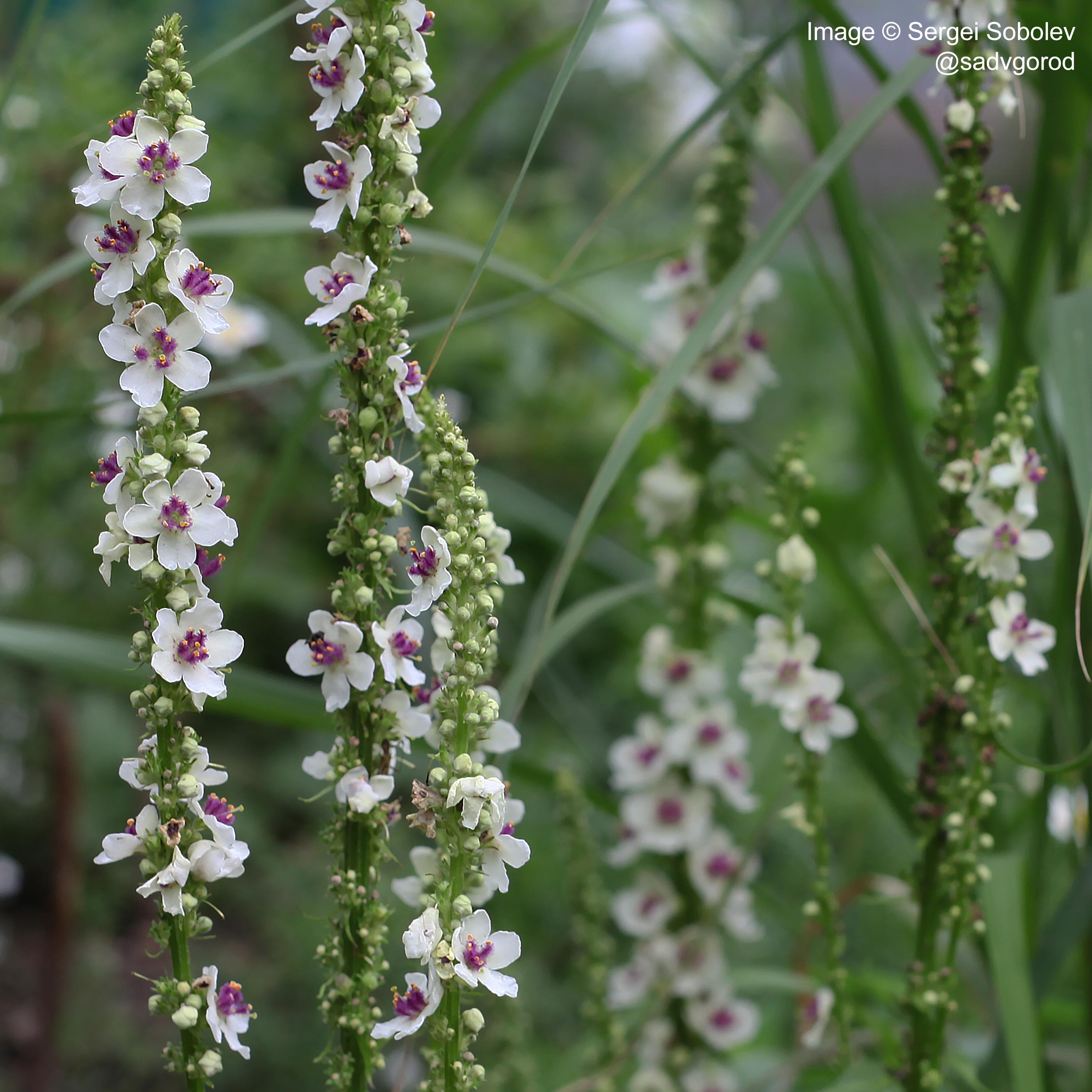Роскошный сорт коровяка: каждый стебель формирует многожество свечей-соцветий. Цветы белые с фиолетовыми пестиками. Для заднего плана цветника и массовой или кластерной посадки в цветнике Новой волны. Редкость.